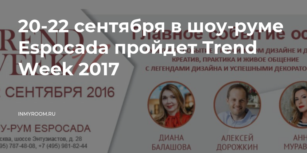 20-22 сентября в флагманском шоу-руме Espocada пройдет Trend Week 2017 – ежегодный фестиваль для дизайнеров, архитекторов, декораторов и всех, кто интересуется дизайном интерьера.