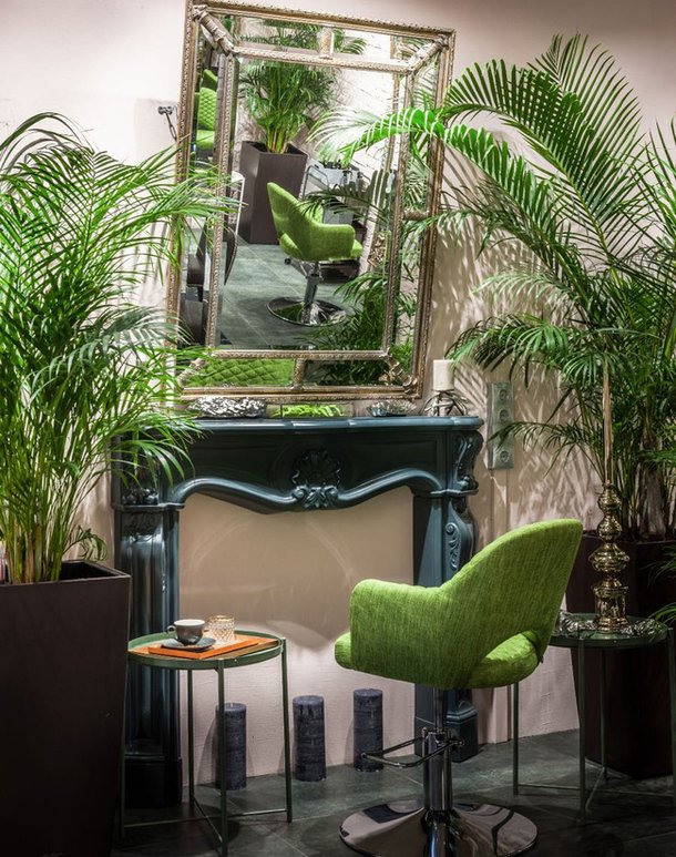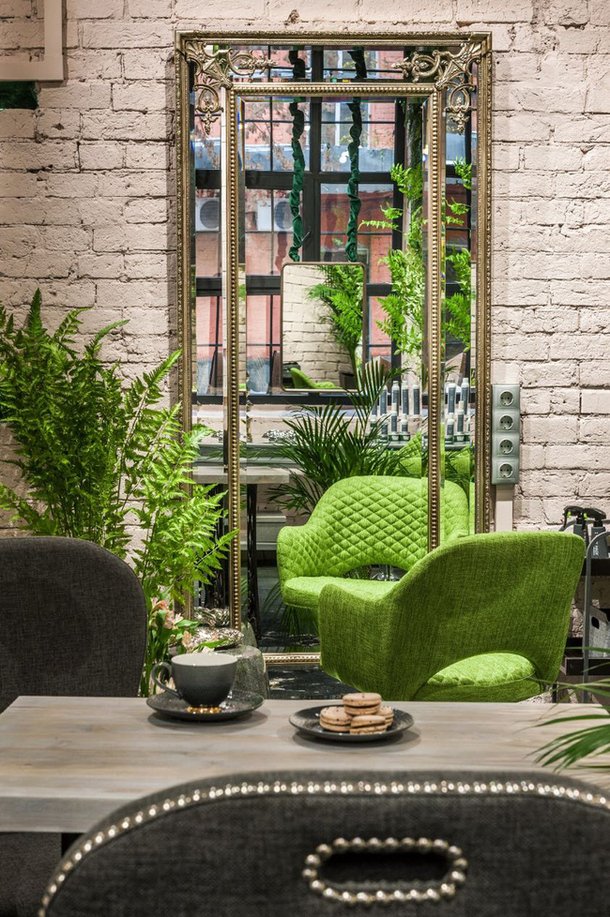Раньше на месте салона красоты была фабрика, поэтому интерьер бьюти-бара выполнен в стиле лофт, но не в типичном брутальном ключе, а в жизнерадостно-нежной интерпретации. Старинные люстры Марина Брагинская привезла из парижского блошиного рынка – отсюда французский шарм в интерьере Цvети. Кстати, главный колер в цветовой гамме интерьера – травяной зеленый – стал цветом 2017 года по версии Pantone.