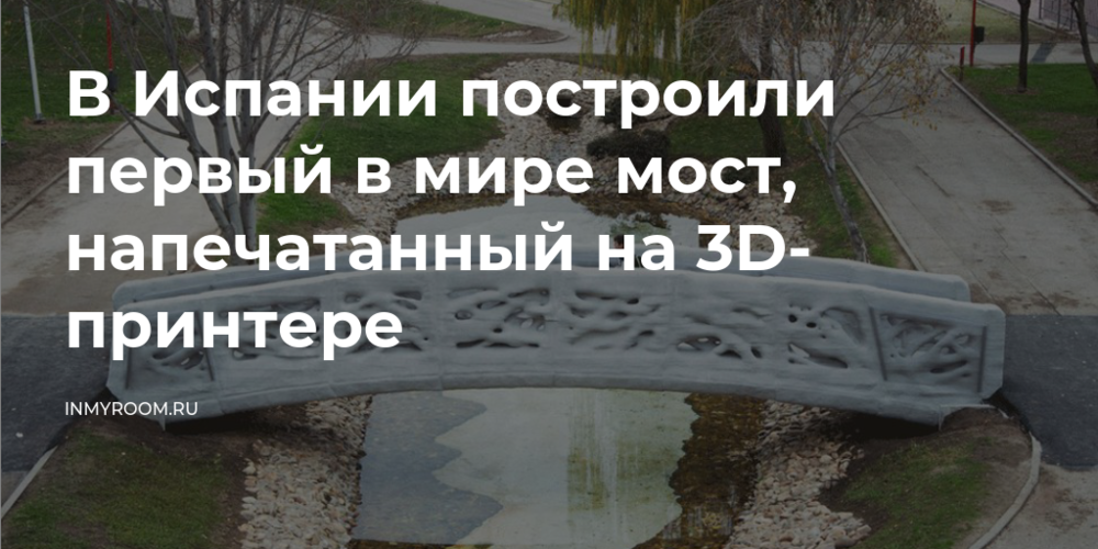 В Испании построили первый в мире мост, напечатанный на 3D-принтере. Пешеходный мост длиной 12 метров и шириной 1,75 метра появился в мадридском парке Кастилия-Ла-Манча.