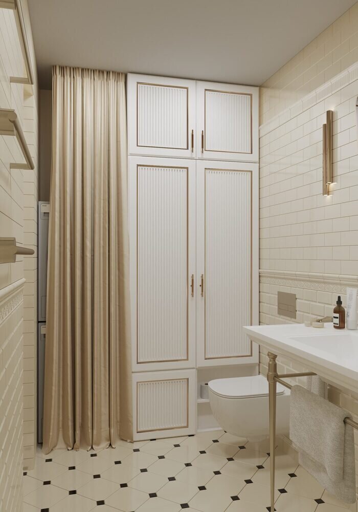 «В ванной нам удалось разместить все необходимое и даже поставить отдельностоящую ванну — это мечта хозяйки. Я считаю, что необязательно отгораживать ванну шторками или стеклом. Не вижу проблемы, если на пол попадает вода. Если полы сделать теплыми, вода высохнет за 20 минут. Но в данном случае заказчица попросила шторки. Для них будет заказан овальный бронзовый карниз с креплением в потолок и стены. Также мы предусмотрели закладные для крепления этого карниза», — рассказывает дизайнер.