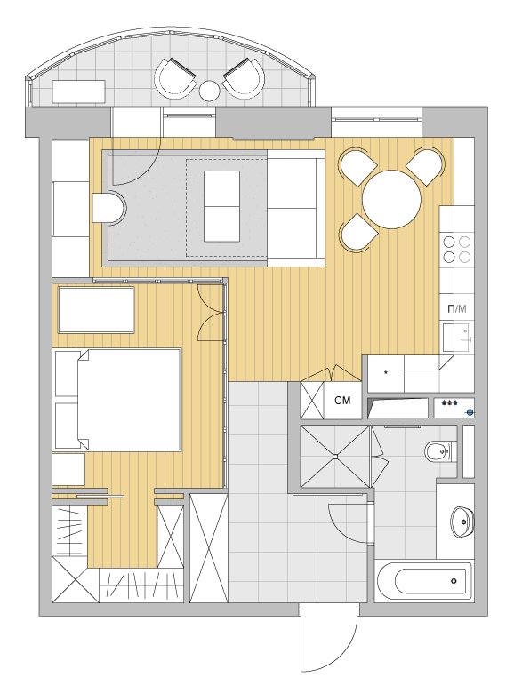 Фотография: Планировки в стиле , Перепланировка, как из однушки сделать трешку, Светлана Старцева, Massimos, однокомнатная квартира для семьи, как обустроить однокомнатную квартиру для пары с ребенком – фото на INMYROOM