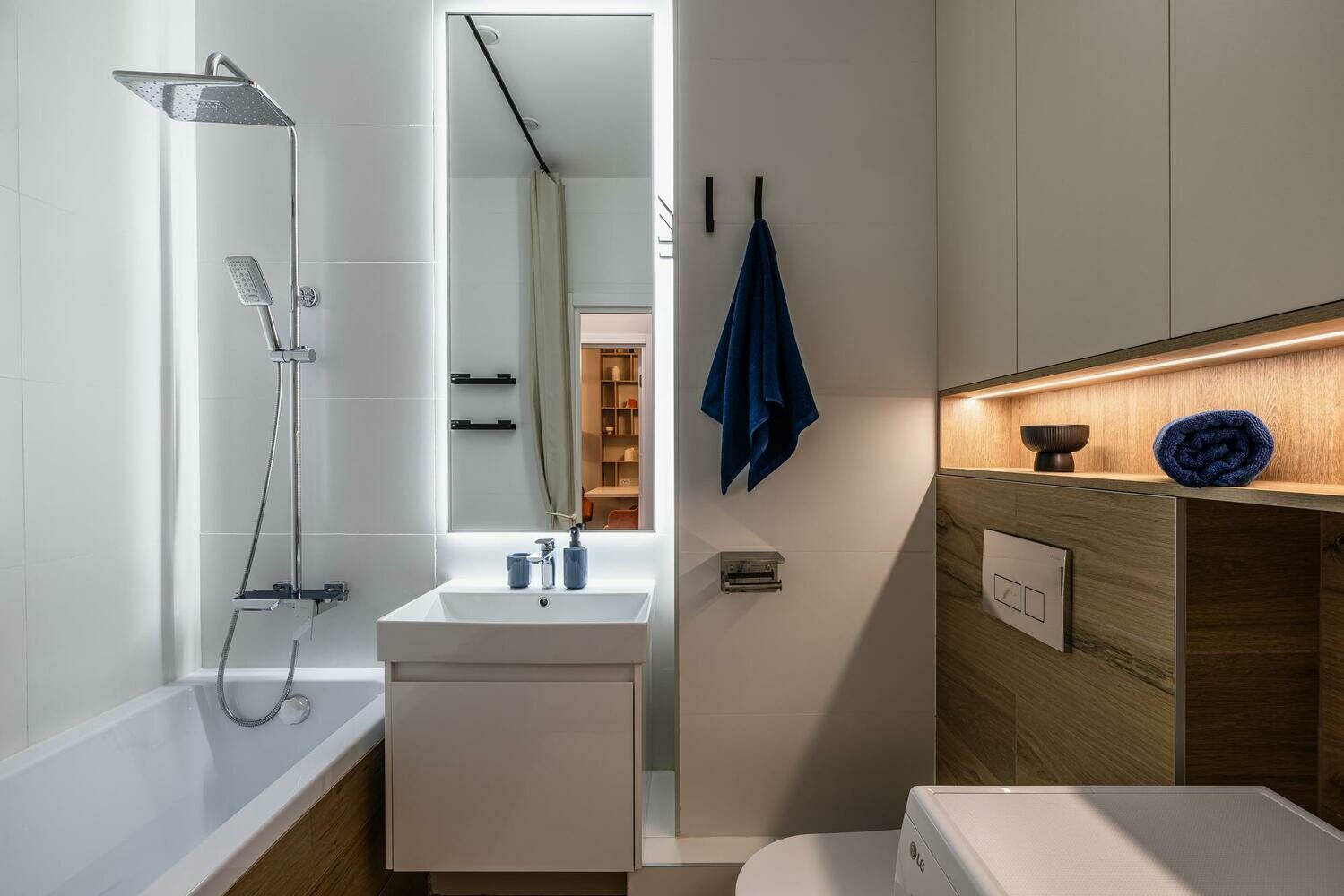 Фотография: Ванная в стиле Современный, Малогабаритная квартира, Квартира, Проект дня, 1 комната, до 40 метров, ЖК «Скандинавия», Ольга Мирзабаева – фото на INMYROOM