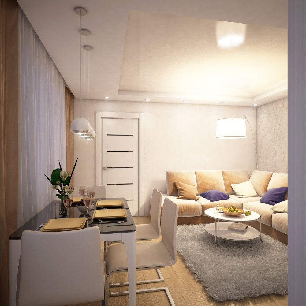 Фотография:  в стиле , Квартира, Россия, Минимализм, Проект недели, Lightstar, Odeon Light, Citilux, кухня-гостиная дизайн, интерьер двушки, Вологда, Vives Sutton, Ceranosa Plaqueta, Grandeco Aurora, Kronospan Castello, Cristacer Merida, NS Mosaic, Юлия Мяскова, как обустроить двушку для молодой семьи, Монолитный дом, 2 комнаты, 40-60 метров – фото на INMYROOM
