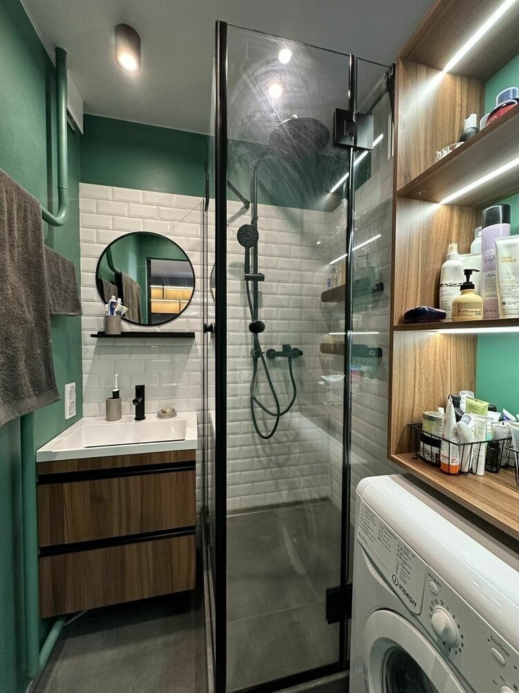 Ванная комната 2 м² в брежневке: до и после — стиральная машина, душевая и окно на кухню4,6