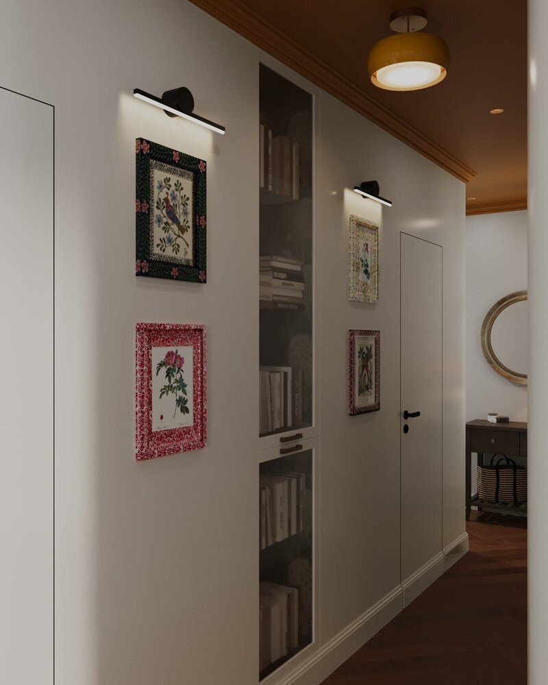 Смелые решения в трешке 78 м² с двумя кабинетами, барабанной установкой и стеклоблокамиДизайн