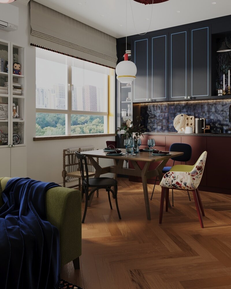 Смелые решения в трешке 78 м² с двумя кабинетами, барабанной установкой и стеклоблокамиДизайн