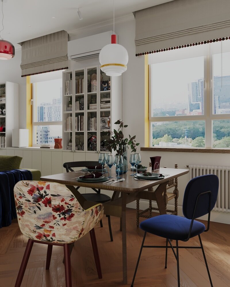 Смелые решения в трешке 78 м² с двумя кабинетами, барабанной установкой и стеклоблокамиДизайн