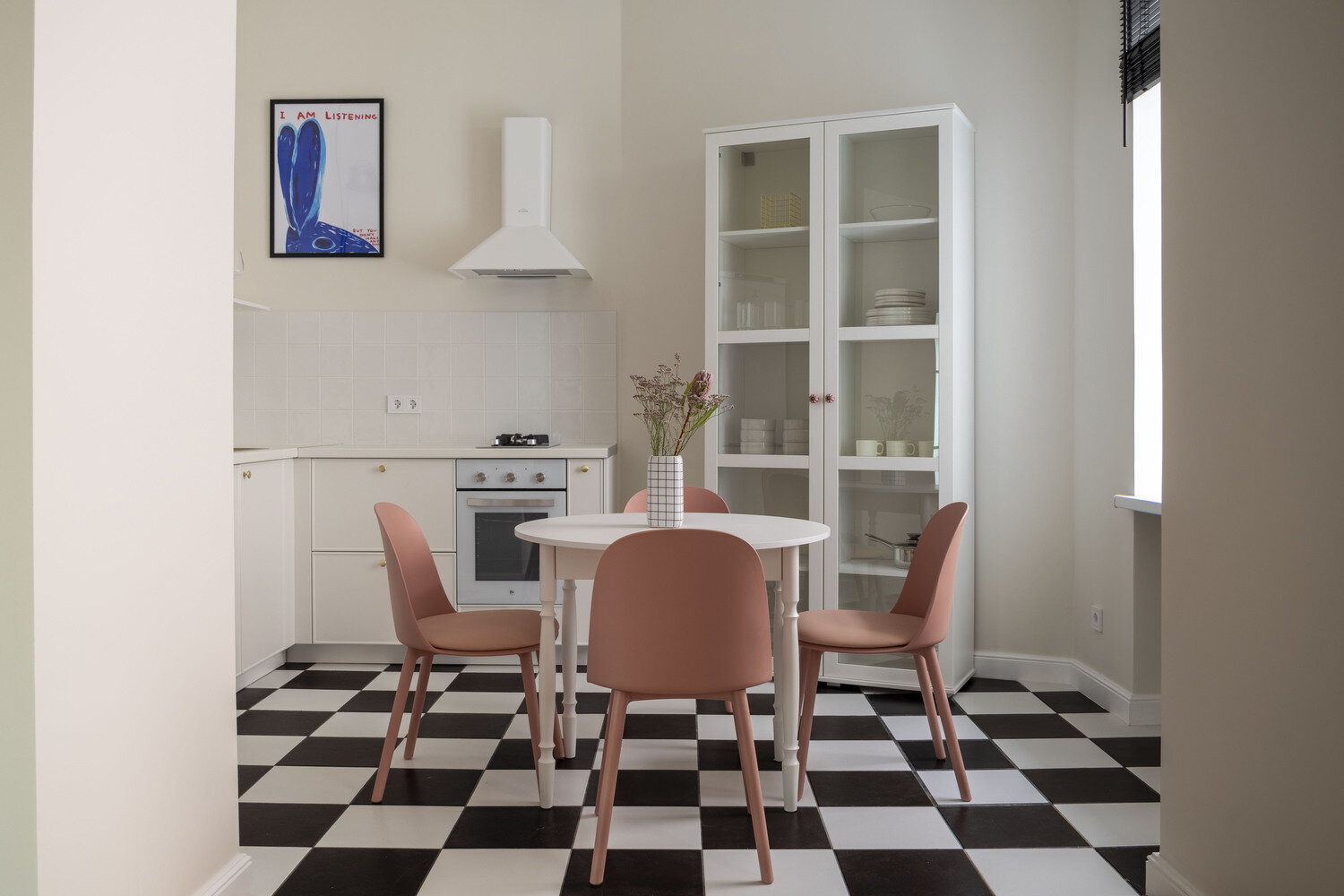 Фотография: Кухня и столовая в стиле Современный, Эклектика, Квартира, Проект дня, Санкт-Петербург, Кирпичный дом, 2 комнаты, 60-90 метров, современный с элементами минимализма и арт-деко, Постели Ковёр – фото на INMYROOM