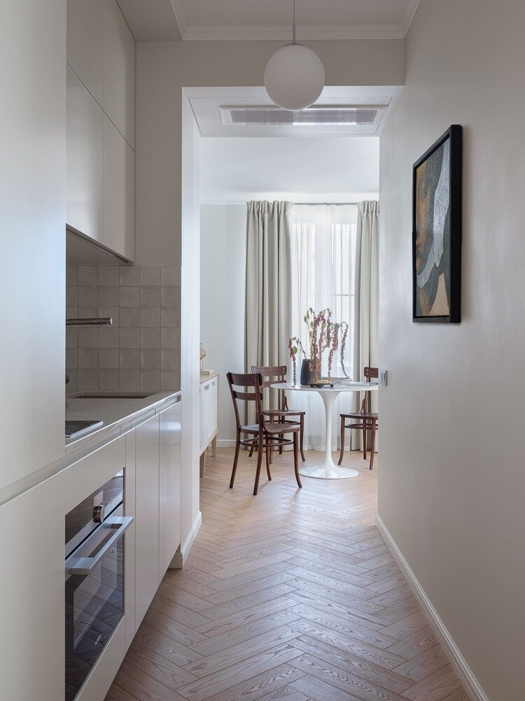 Фотография: Кухня и столовая в стиле Современный, Эклектика, Малогабаритная квартира, Квартира, Проект дня, Москва, Монолитный дом, 2 комнаты, 40-60 метров, Маргарита Зенова, современный с элементами классики и минимализмом, М-Бюро, Александра Багрицевич – фото на INMYROOM