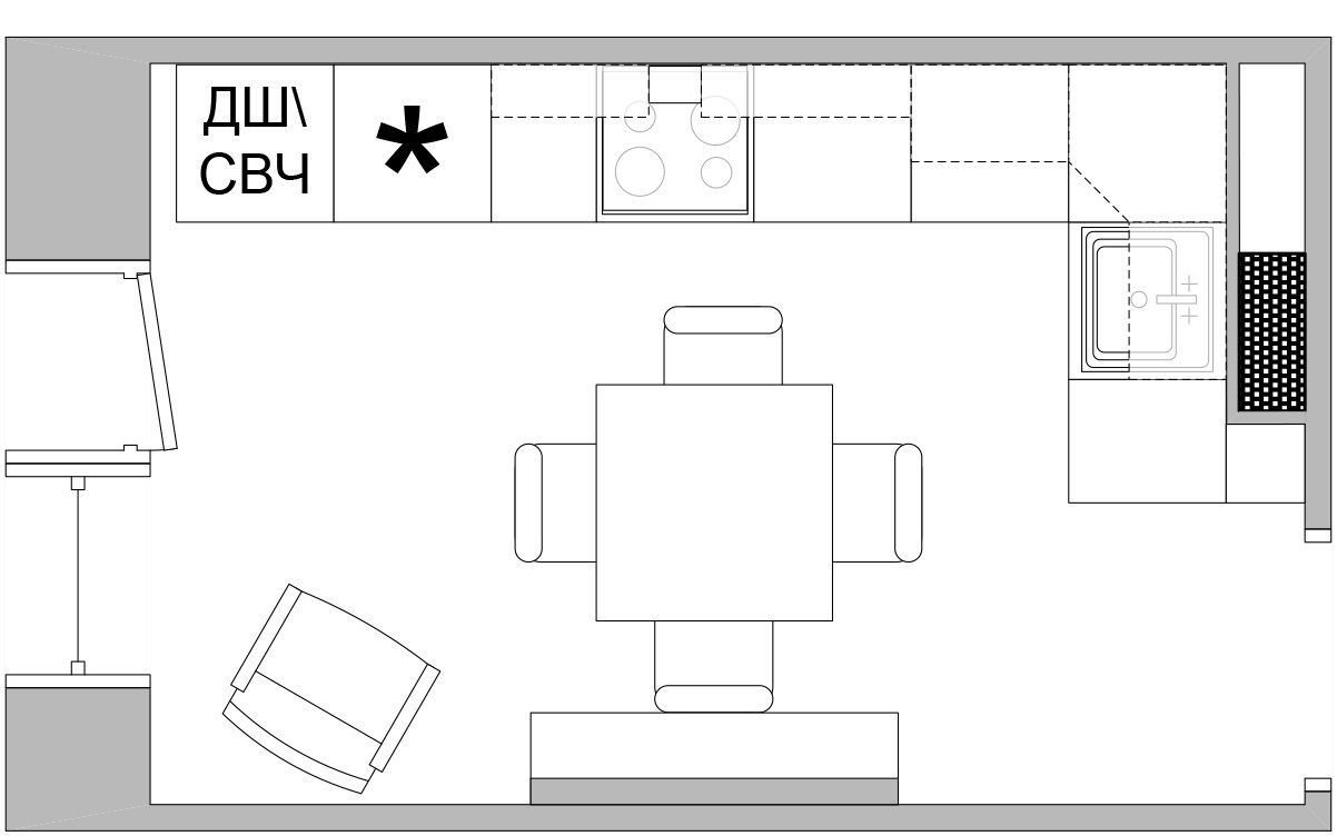 Дизайн узкой кухни