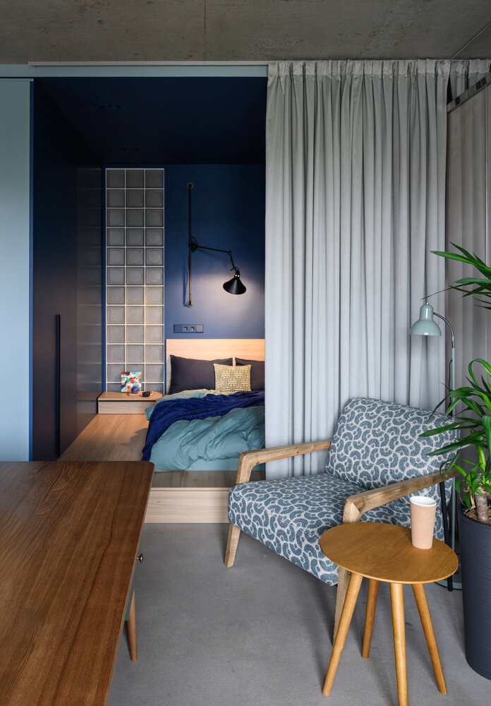 Как обустроили студию 55 м² для IT-специалиста: натуральные фактуры, бетон и стеклоблоки4,6