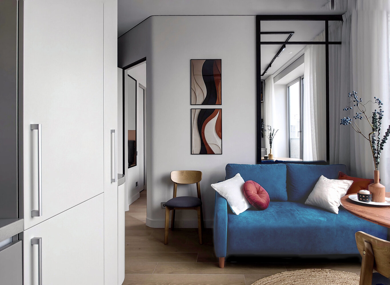 Фотография: Кухня и столовая в стиле Современный, Малогабаритная квартира, Квартира, Проект дня, Москва, Монолитный дом, 1 комната, до 40 метров, Юлия Гордеева, современный с элементами минимализма и скандинавского стиля, ЖК «Логос» – фото на INMYROOM