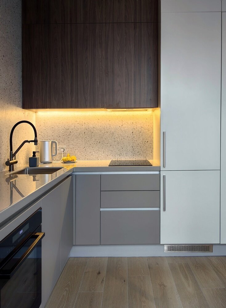 Фотография: Кухня и столовая в стиле Современный, Малогабаритная квартира, Квартира, Проект дня, Москва, Монолитный дом, 1 комната, до 40 метров, Юлия Гордеева, современный с элементами минимализма и скандинавского стиля, ЖК «Логос» – фото на INMYROOM