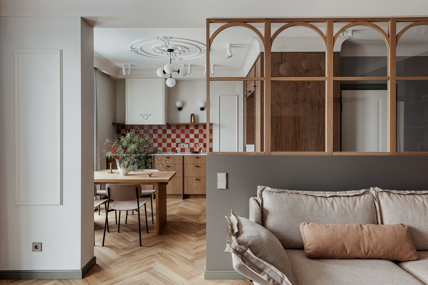 Современный комфорт и ретро 50–60-х: микс стилей в минской трешке 82 м² с панорамными окнамиДизайн