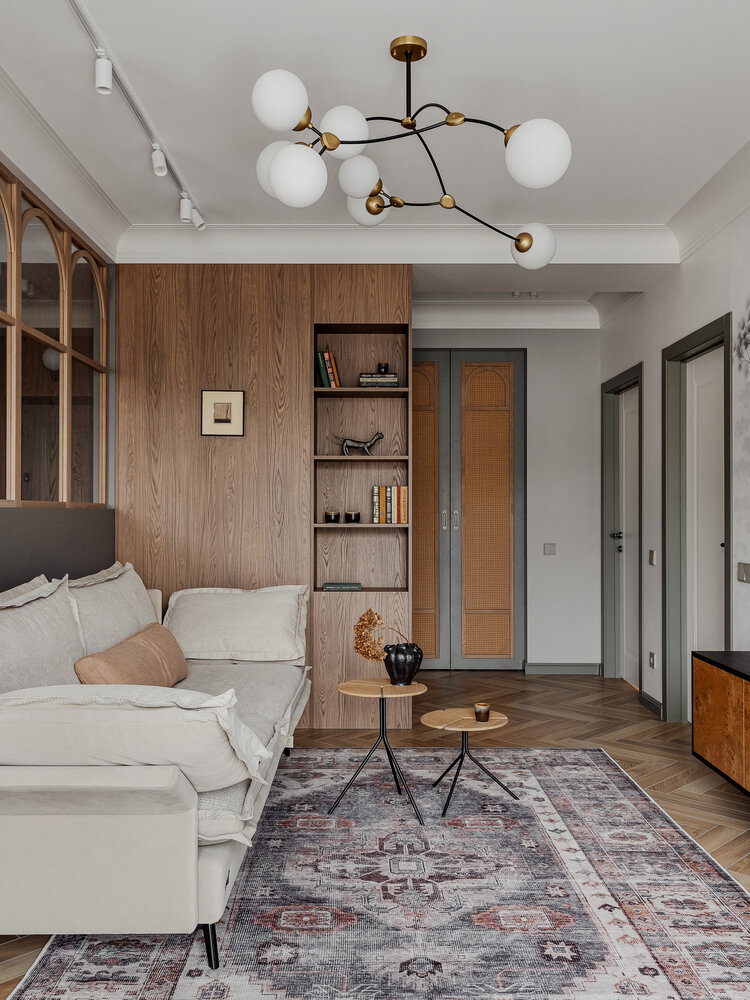 Современный комфорт и ретро 50–60-х: микс стилей в минской трешке 82 м² с панорамными окнамиДизайн