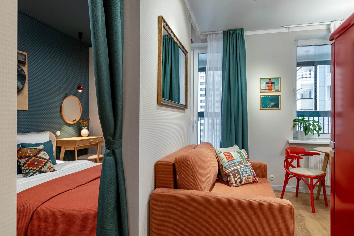 Фотография: Спальня в стиле Современный, Малогабаритная квартира, Квартира, Студия, Проект дня, Москва, до 40 метров, малогабаритки, современный с элементами ретро, фото интерьера, дизайн интерьера фото, Светлана Немцова – фото на INMYROOM