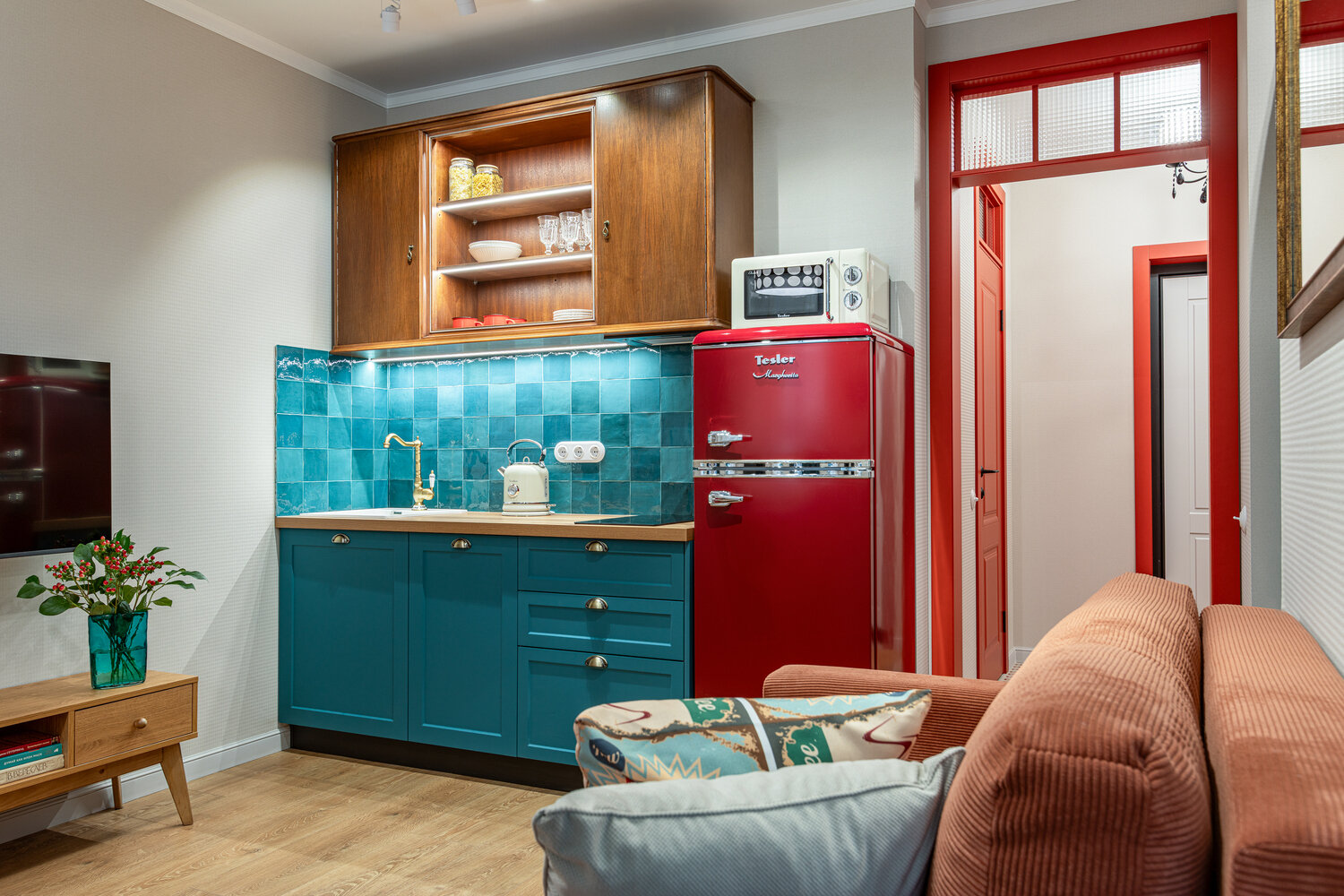 Фотография: Кухня и столовая в стиле Современный, Малогабаритная квартира, Квартира, Студия, Проект дня, Москва, до 40 метров, малогабаритки, современный с элементами ретро, фото интерьера, дизайн интерьера фото, Светлана Немцова – фото на INMYROOM