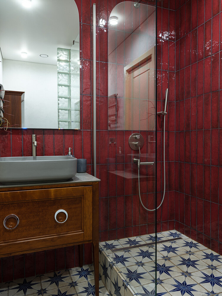 Санузел с винной плиткой и перегородкой из стеклоблоков4,7