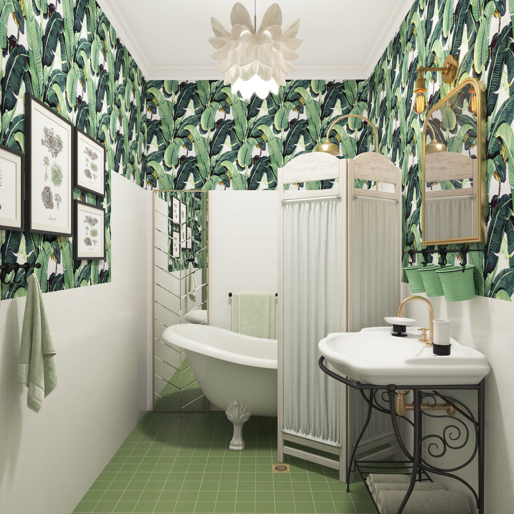 Фотография:  в стиле , Ванная, Белый, Проект недели, Зеленый, ИКЕА, Nicolazzi, Loft Design, Анна Веретенникова, Нижний Новгород, Volevatch, Martinique "A" Wallpaper, Роман Вескер, объединение ванны и санузла, как оформить маленький санузел, Imola Ceramica Tint, как объединить ванную и туалет, как оформить маленькую ванную, интерьер маленькой ванной, дизайн маленького санузла – фото на INMYROOM
