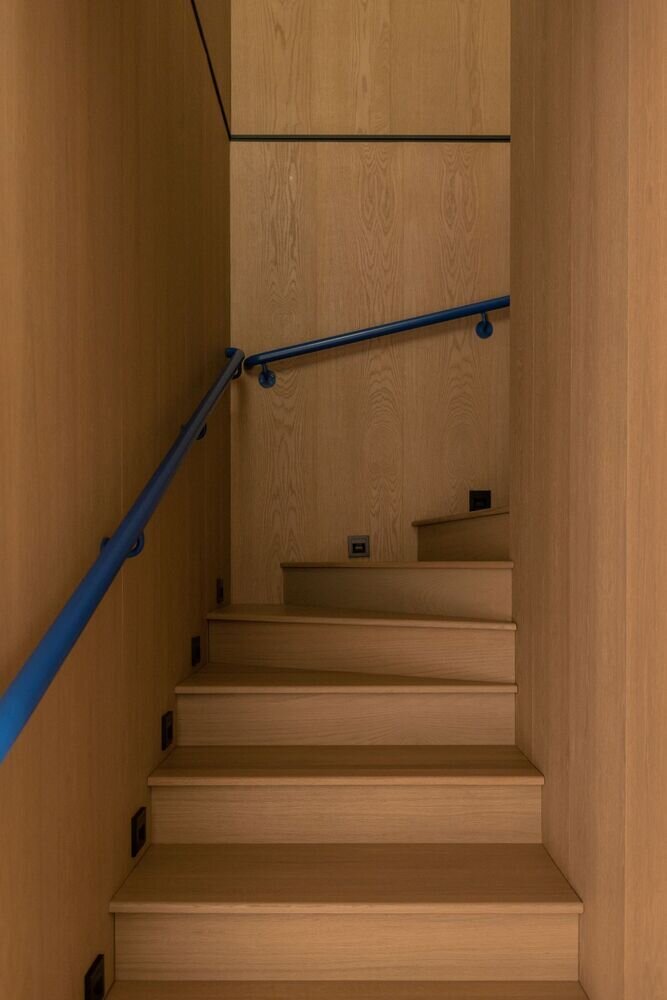 Лестница, соединяющая общественную и приватную зоны, отделана шпоном дуба.