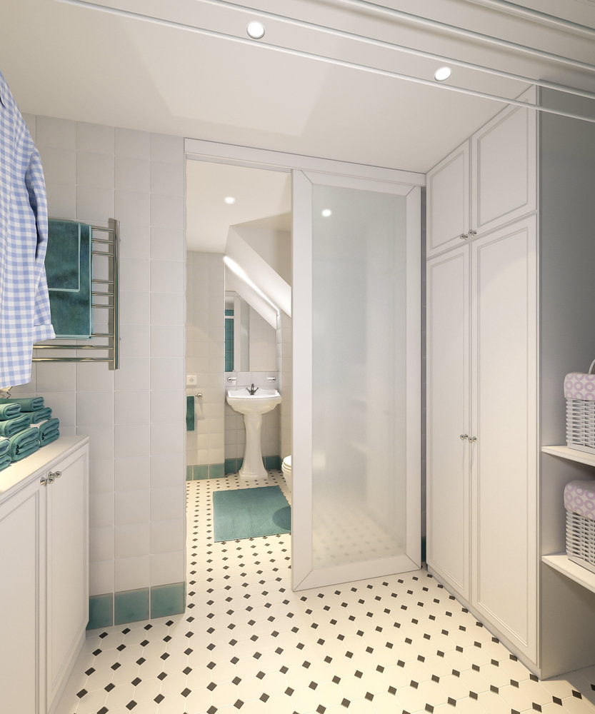 Фотография:  в стиле , Ванная, Белый, Проект недели, Бирюзовый, Виктория Малышева, Ленинградская область, душевая кабина в ванной, какую душевую кабину установить в ванной, Рощино – фото на INMYROOM