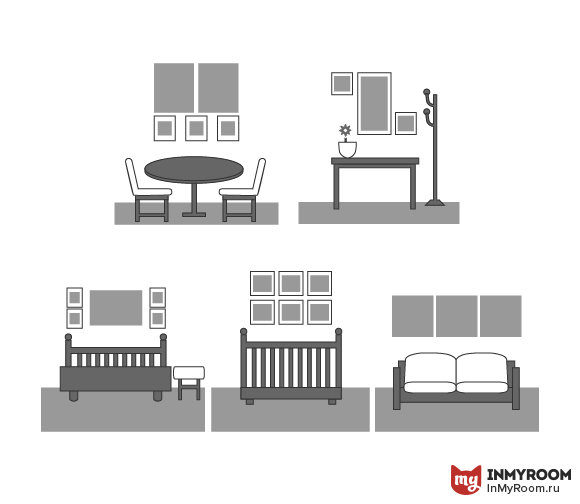 Фотография:  в стиле , Советы, Инфографика, как развесить картины в гостиной, как развесить картины в столовой, композиция из прямоугольных картин, композиция из постеров – фото на INMYROOM