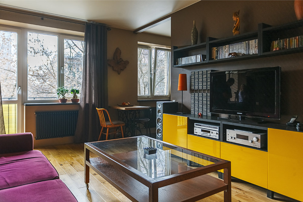 Фотография: Гостиная в стиле Современный, Квартира, Россия, Проект недели, Новая Москва, Максим Ковалевский, переделка хрущевки, как обустроить двухкомнатную квартиру в хрущевки, как из типовой квартиры сделать студию, ремонт хрущевки, видео, Хрущевка – фото на INMYROOM