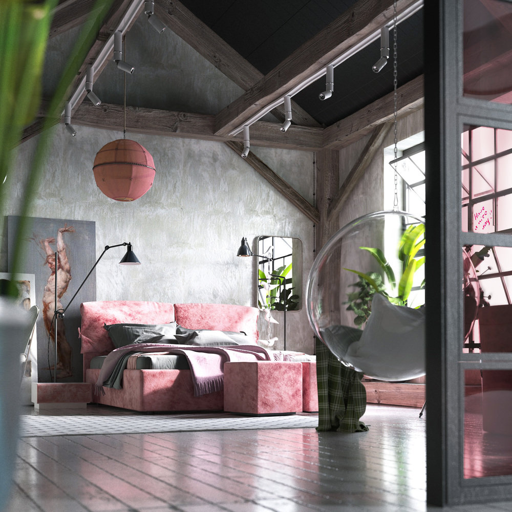 Бетонные стены и розовая мебель: спальня в стиле лофт4,9