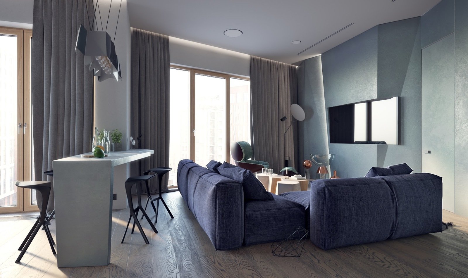 Фотография: Гостиная в стиле Современный, Квартира, Россия, Архитектура, Проект недели, Москва, Синий, Серый, Панорамные окна, ЖК Садовые Кварталы, Хамовники, архитектурная студия MOPS, Встроенные шкафы, Ольга Хованская, Мария Степанова – фото на INMYROOM
