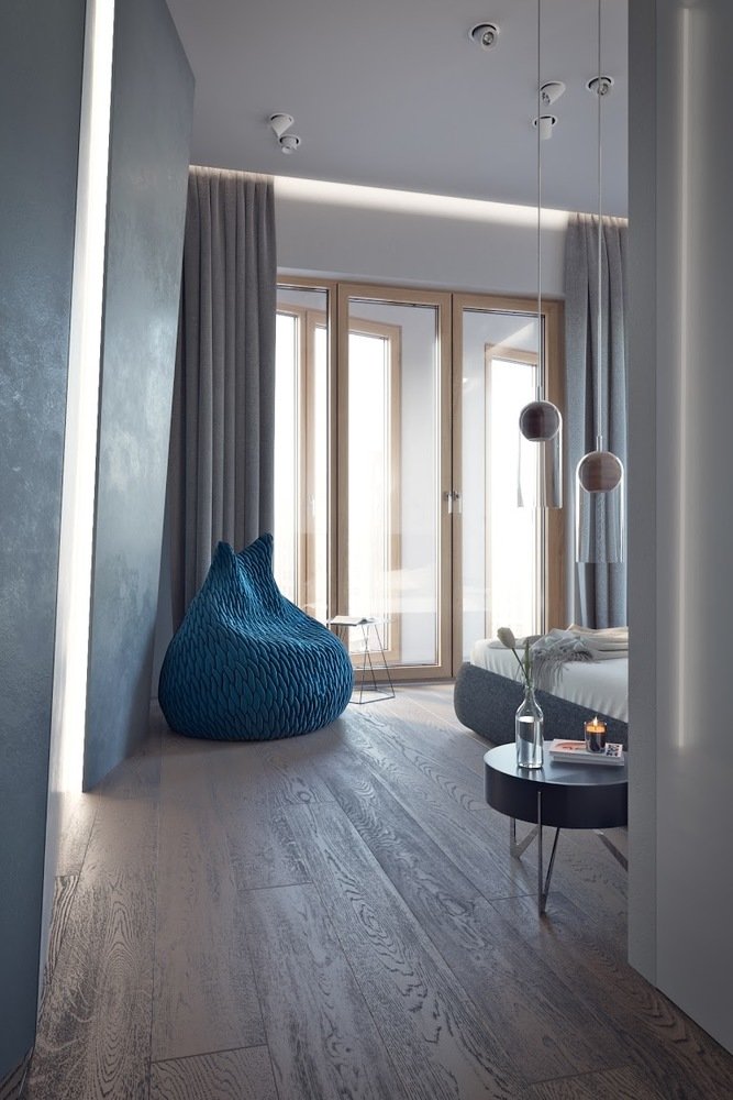 Фотография: Спальня в стиле Современный, Квартира, Россия, Архитектура, Проект недели, Москва, Синий, Серый, Панорамные окна, ЖК Садовые Кварталы, Хамовники, архитектурная студия MOPS, Встроенные шкафы, Ольга Хованская, Мария Степанова – фото на INMYROOM