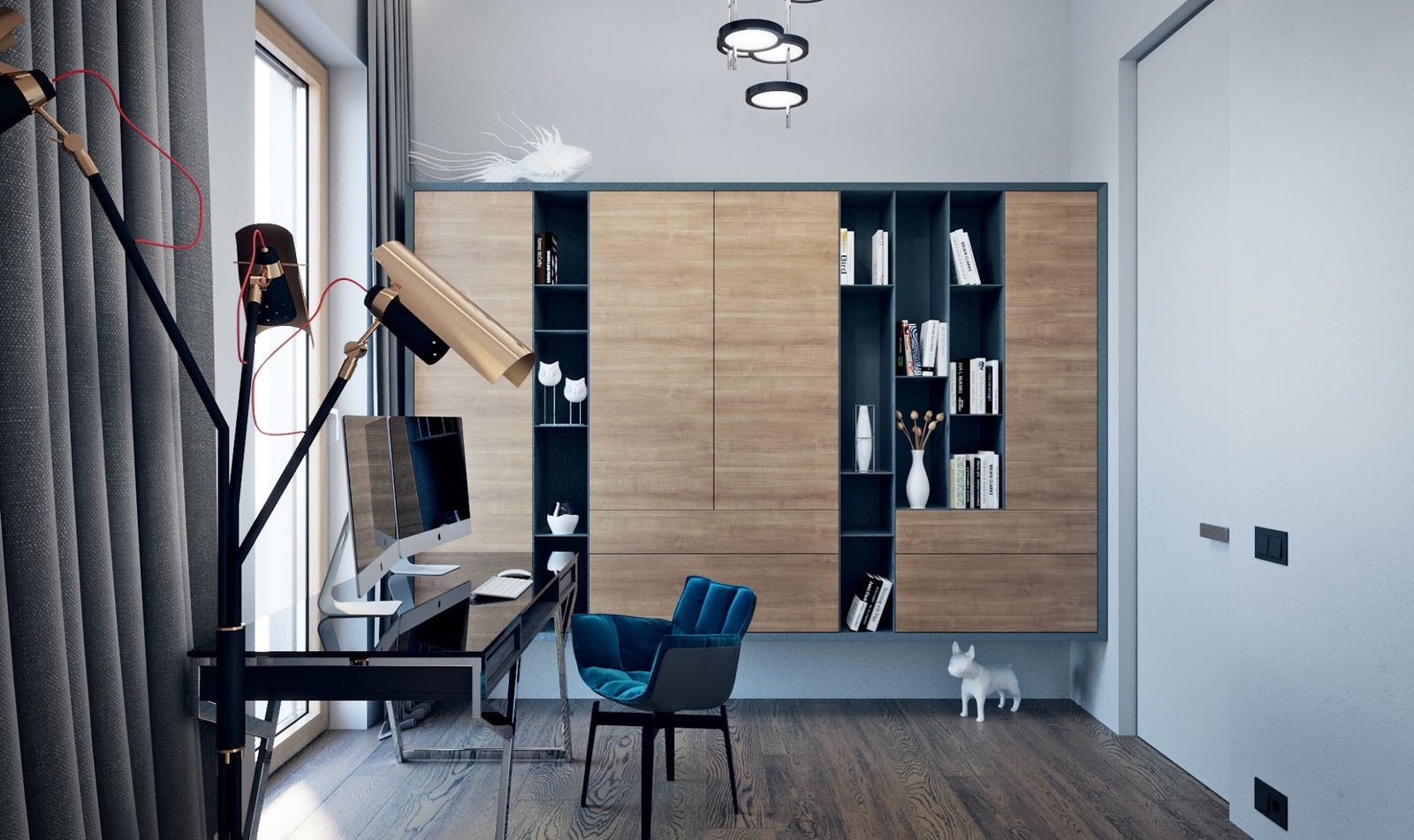 Фотография: Кабинет в стиле Современный, Квартира, Россия, Архитектура, Проект недели, Москва, Синий, Серый, Панорамные окна, ЖК Садовые Кварталы, Хамовники, архитектурная студия MOPS, Встроенные шкафы, Ольга Хованская, Мария Степанова – фото на INMYROOM