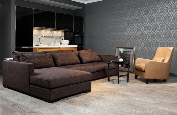 Фотография: Гостиная в стиле Лофт, Кухня и столовая, Декор интерьера, Квартира, Студия, Дом, Мебель и свет, угловой диван в интерьере – фото на INMYROOM