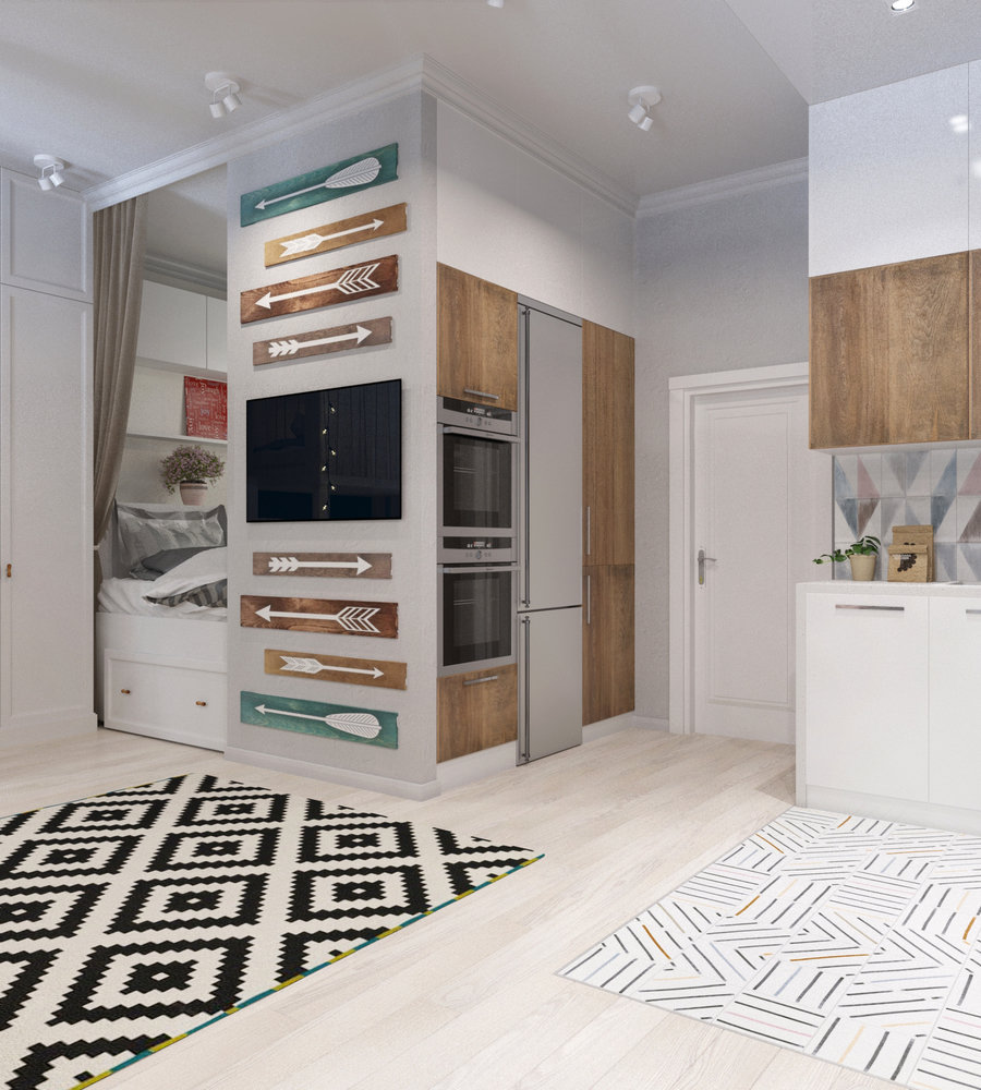 Фотография: Гостиная в стиле Скандинавский, Квартира, Студия, Проект недели, Сургут, новостройка, кухня в нише, Диляра Сайфутдинова, Монолитный дом, 40-60 метров – фото на INMYROOM