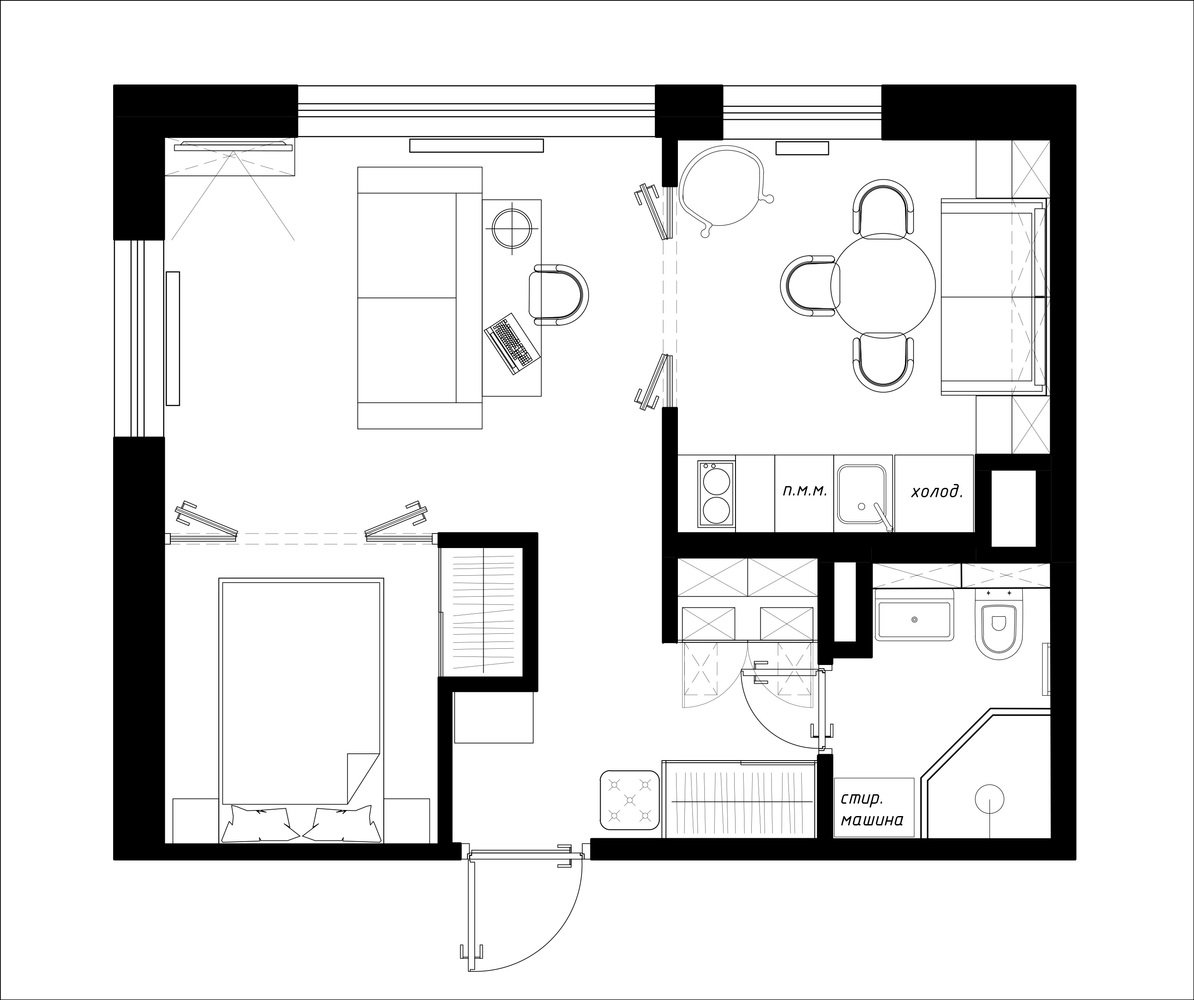 Вариант расстановки мебели в угловой квартире