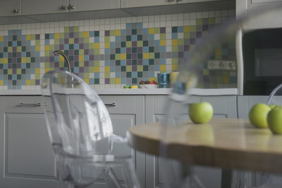 Фотография: Кухня и столовая в стиле Скандинавский, Современный, Эклектика, Квартира, Россия, Планировки, KARE Design, Декор, Проект недели, Перепланировка, Желтый, Серый, Фуксия, Ремонт на практике, ИКЕА, Villeroy & Boch, Одинцово, Benjamin Moore, JuJu, Witex, Smart Balls, Инна Величко, Панельный дом, 3 комнаты, 60-90 метров, П44т – фото на INMYROOM