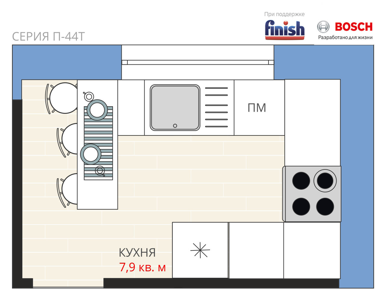 3 интересных варианта планировки кухни в П-44Т4,2