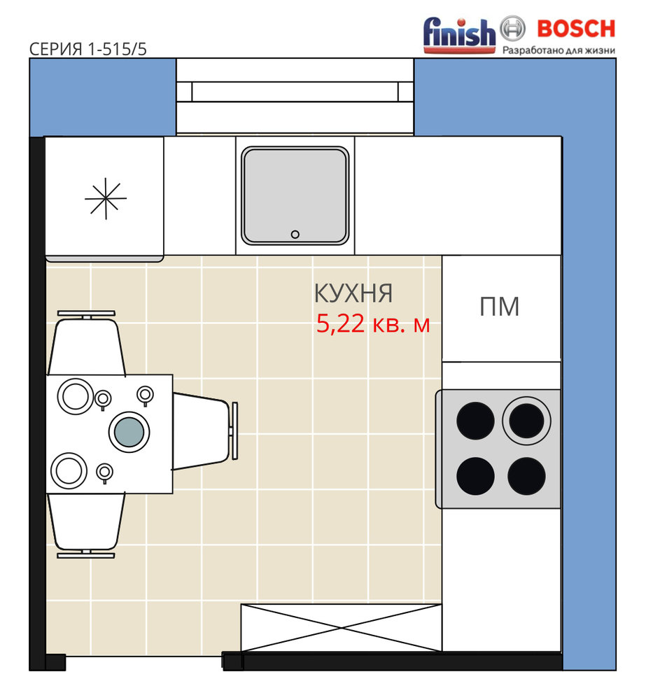 Фотография:  в стиле , Кухня и столовая, BOSCH, Перепланировка, Анастасия Киселева, Панельный дом, Finish, 1 комната, до 40 метров, I-515/5 – фото на INMYROOM