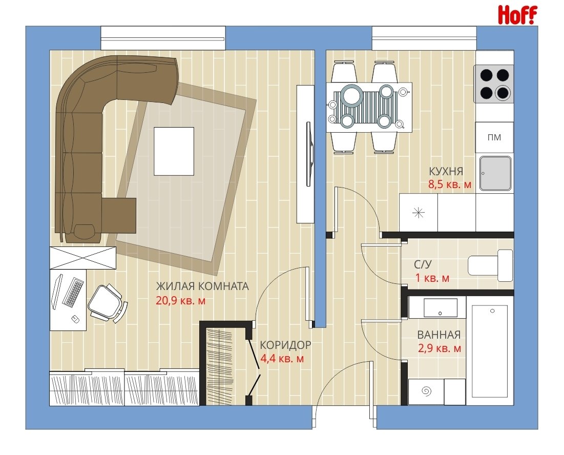 Фотография:  в стиле , Квартира, HOFF, Перепланировка, HOFF, Анастасия Киселева, П-55, Панельный дом, 1 комната, до 40 метров – фото на INMYROOM