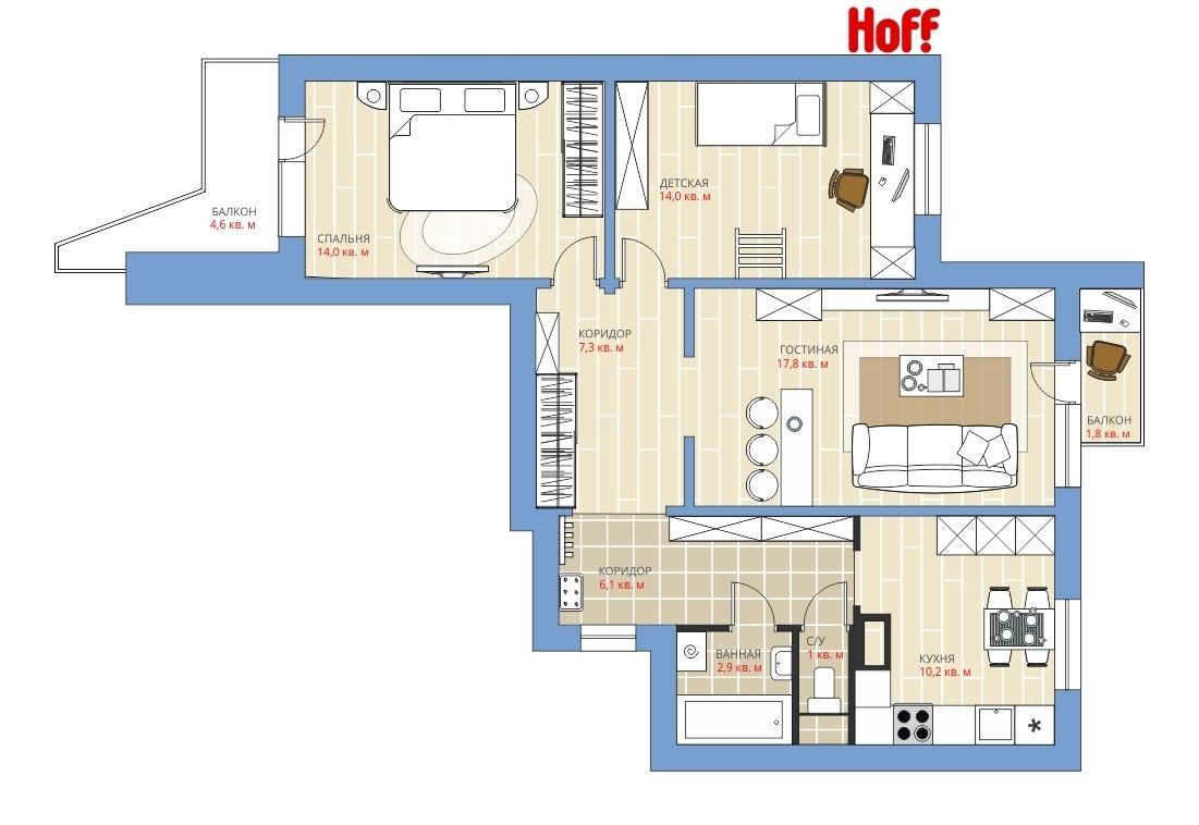 Фотография:  в стиле , Квартира, HOFF, Перепланировка, HOFF, Анастасия Киселева, Панельный дом, П-3, 3 комнаты, 60-90 метров – фото на INMYROOM