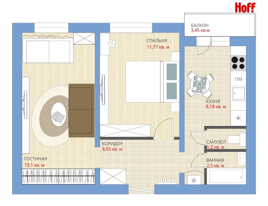 Фотография:  в стиле , Квартира, Планировки, HOFF, Перепланировка, HOFF, П-43, Анастасия Киселева, 2 комнаты, 40-60 метров – фото на INMYROOM