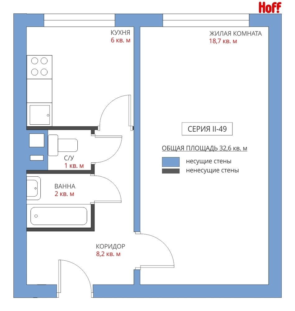 Фотография:  в стиле , Квартира, Планировки, HOFF, Перепланировка, HOFF, II-49, Анастасия Киселева, Панельный дом, 1 комната, до 40 метров – фото на INMYROOM