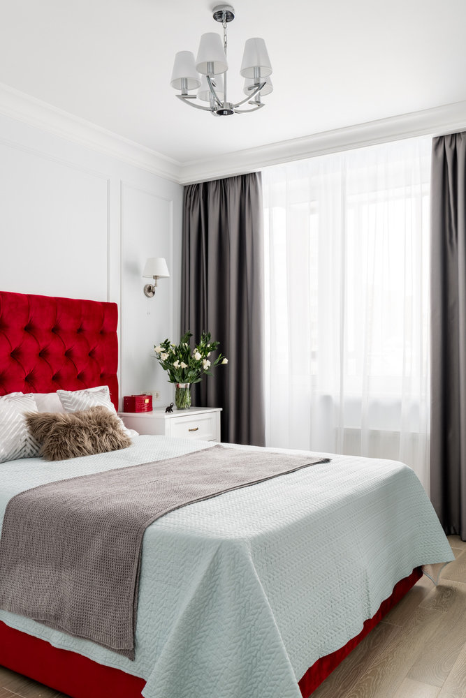 Двушка с синей кухней и красной кроватью в спальне4,8
