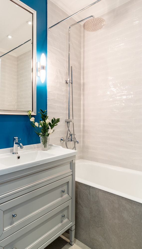 Двушка с синей кухней и красной кроватью в спальне4,8