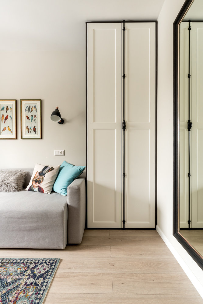 Что касается систем хранения, от идеи отдельной гардеробной отказались сразу — она съедает много пространства. А вот компактные, отдельно стоящие шкафы и комоды в комнатах — отличный вариант для тех, кто не прочь через некоторое время сделать перестановку.