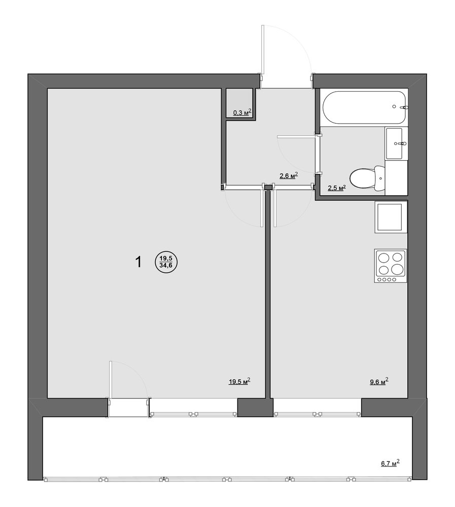 Обмерный план однокомнатной квартиры (34 кв. м) в блочном доме серии II-68-01
