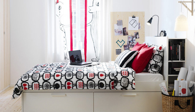 Фотография: Спальня в стиле Скандинавский, Современный, Карта покупок, Мебель и свет, Индустрия, IKEA, Посуда, Стол, Кресло, Светильники, Кровать, Ковер, Люстра, Зеркало, Стеллаж, Журнальный столик, Стул, Бокалы, Кашпо – фото на INMYROOM