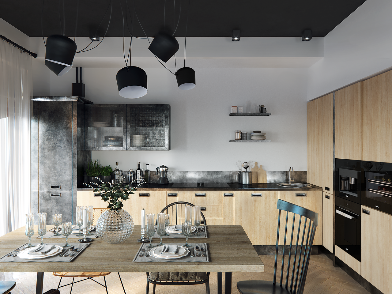 Квартира с мотивами лофта и черными потолкамиГамма