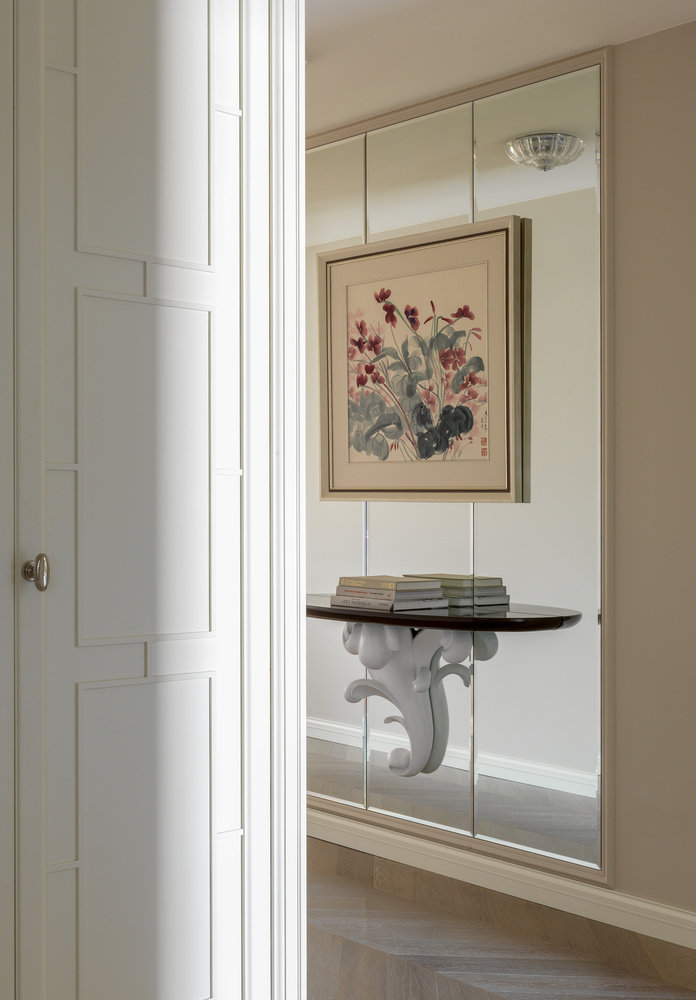Абсолютно все технические элементы, такие как электрощит, бойлер, гребенки, интернет-роутер, сейф, спрятаны в разработанных дизайнером шкафах.
