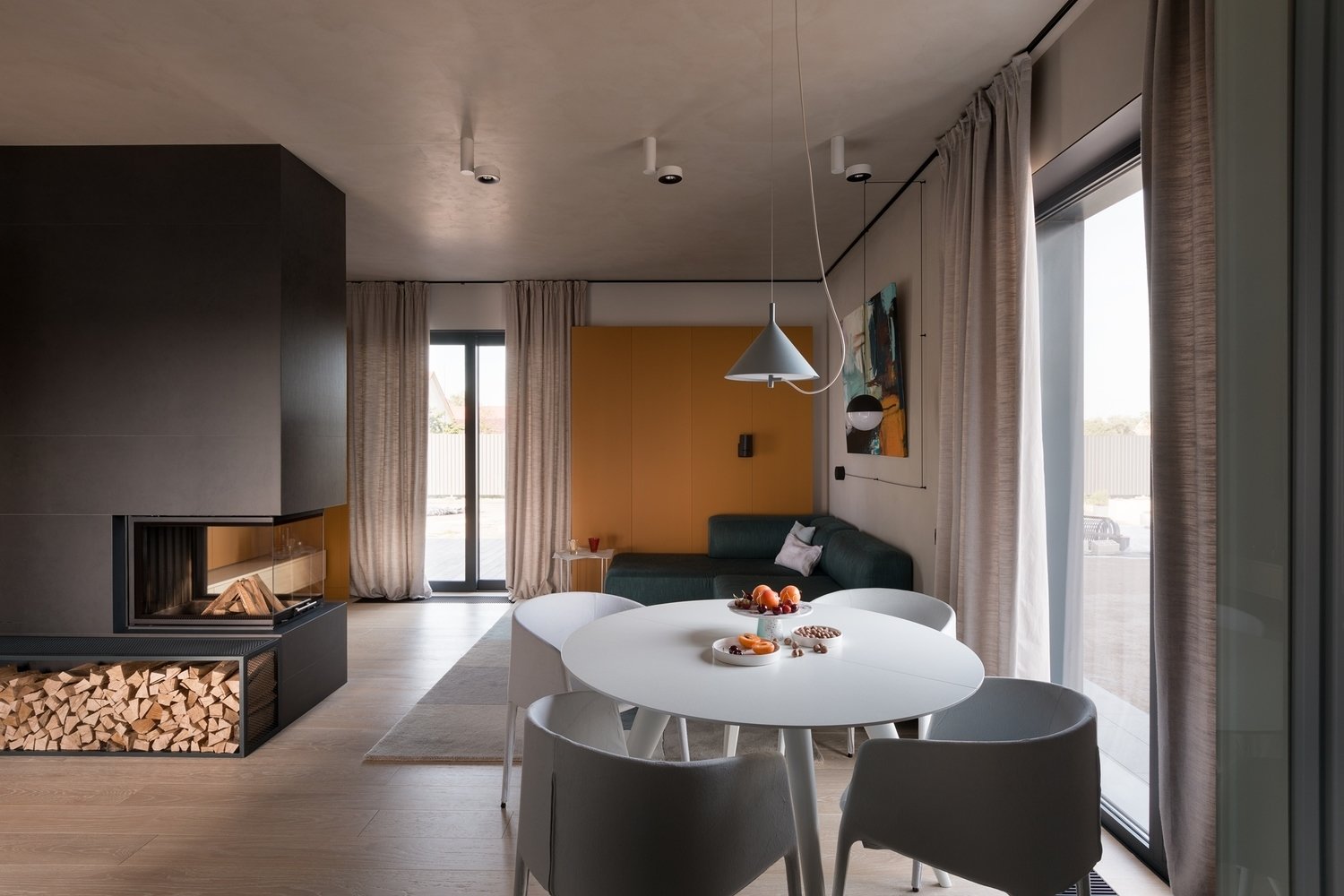 Дизайн двухэтажного дома с кухней-гостиной и камином4,8