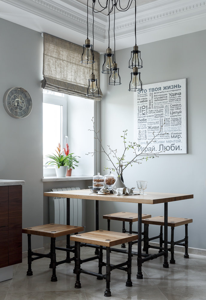 В кухню-гостиную добавили несколько лофтовых предметов: отлично вписались обеденный стол с металлическими ножками-трубами и табуреты. Декоративные настенные кашпо на синей бархатистой стене «смягчили» обстановку. «Получившийся интерьер мне напоминает шкатулку, выложенную мягким жемчужно-серым перламутром, — говорит Яна Ухова. — Это мы и задумывали».